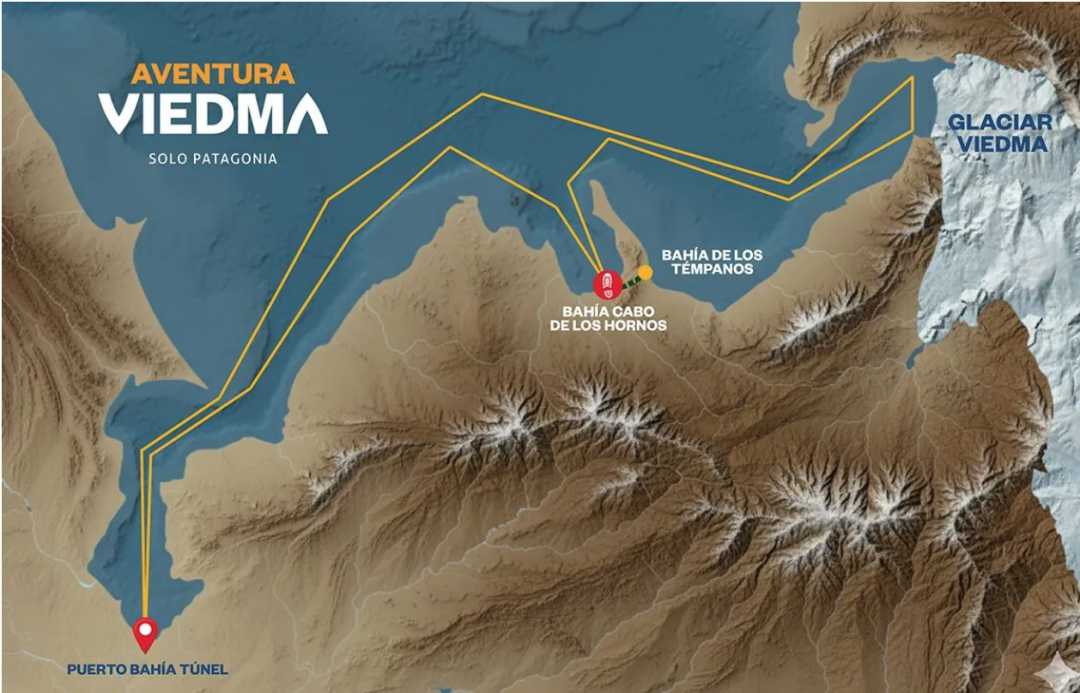 La travesía comienza en el Puerto Bahía Túnel, ubicado a solo 18 km de la ciudad de El Chaltén, la capital argentina del trekking. Desde allí embarcamos en una navegación que se abre paso entre las aguas color turquesa del Lago Viedma. El recorrido inicial nos lleva en dirección sur por la bahía, bordeando la costa y permitiéndonos contemplar de cerca la imponente silueta del Macizo Huemul, una de las montañas más emblemáticas de la región.